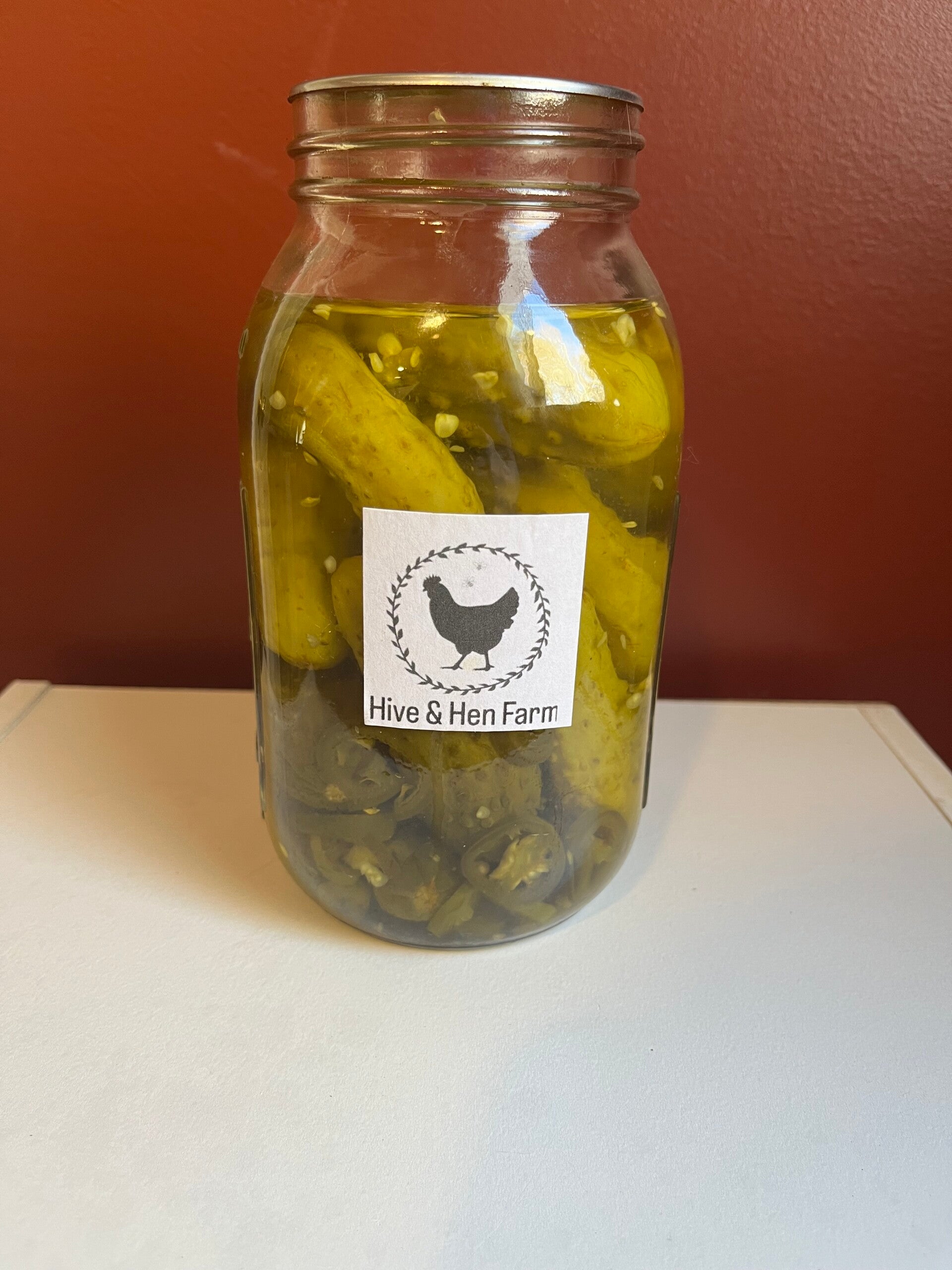 whole pickles, hive & hen pickling dill spice, vinegar, water, jalapeños